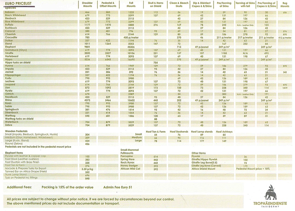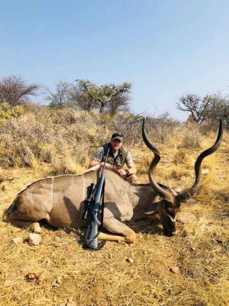 More than 25 different species of game offered: Blesbuck, Bushbuck, Damara Dik-Dik, Duiker, Eland, Oryx, Giraffe, Hartebeest, Impala, Klipspringer, Kudu, Lechwe, Nyala, Roan, Sable, Jackal, Springbok, Steenbok, Tessebee, Waterbuck, Warthog, Blue Wildebeest, Black Wildebeest, Burchell Zebra and Hartmann Zebra. Dangerous Game: Elephant & Buffalo will be hunted in the Caprivi concession areas while Leopard and Rhino on private Namibian land.